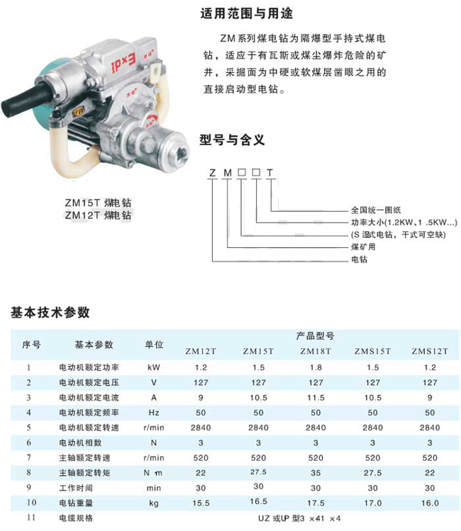 (分為干式 濕式)ZMS12表示1.2kW濕式煤電鉆 ZM15Q表示1.5kW干式強(qiáng)力煤電鉆煤礦井下在硬煤和軟層中作鉆眼用的手持式鉆機(jī),ZM15煤電鉆具有礦用隔爆結(jié)構(gòu)和注水裝置,可以安全用于甲烷與煤塵爆炸危險(xiǎn)的礦井。