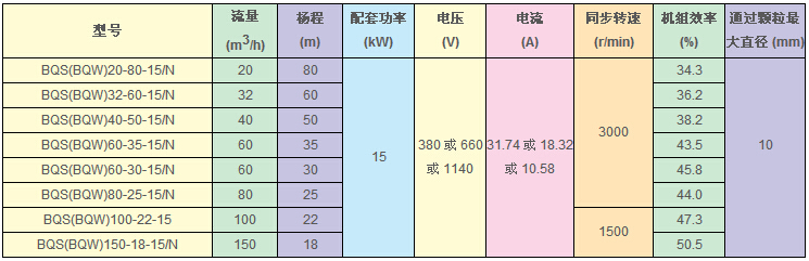 BQS(W)15KW的礦用隔爆型排污排沙潛水電泵技術參數(shù):