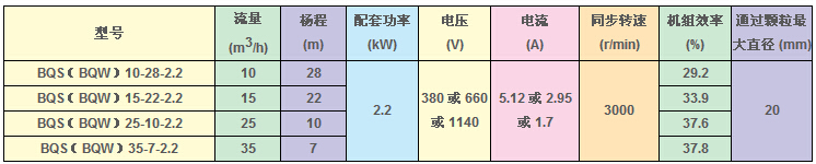 BQS(W)2.2KW的礦用隔爆型排污排沙潛水電泵技術(shù)參數(shù):
