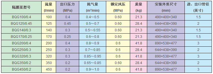 2)、BQG-100/0.4礦用氣動(dòng)隔膜泵由于采用壓縮空氣為動(dòng)力源,因此該泵絕對(duì)防火、防爆,特別適用于高瓦斯礦井和石油、化工等部門使用,另外,該泵還具有體積小、重量輕、吸稱大、揚(yáng)程高、噪音低、結(jié)構(gòu)簡(jiǎn)單,使用和維修方便等特點(diǎn)。